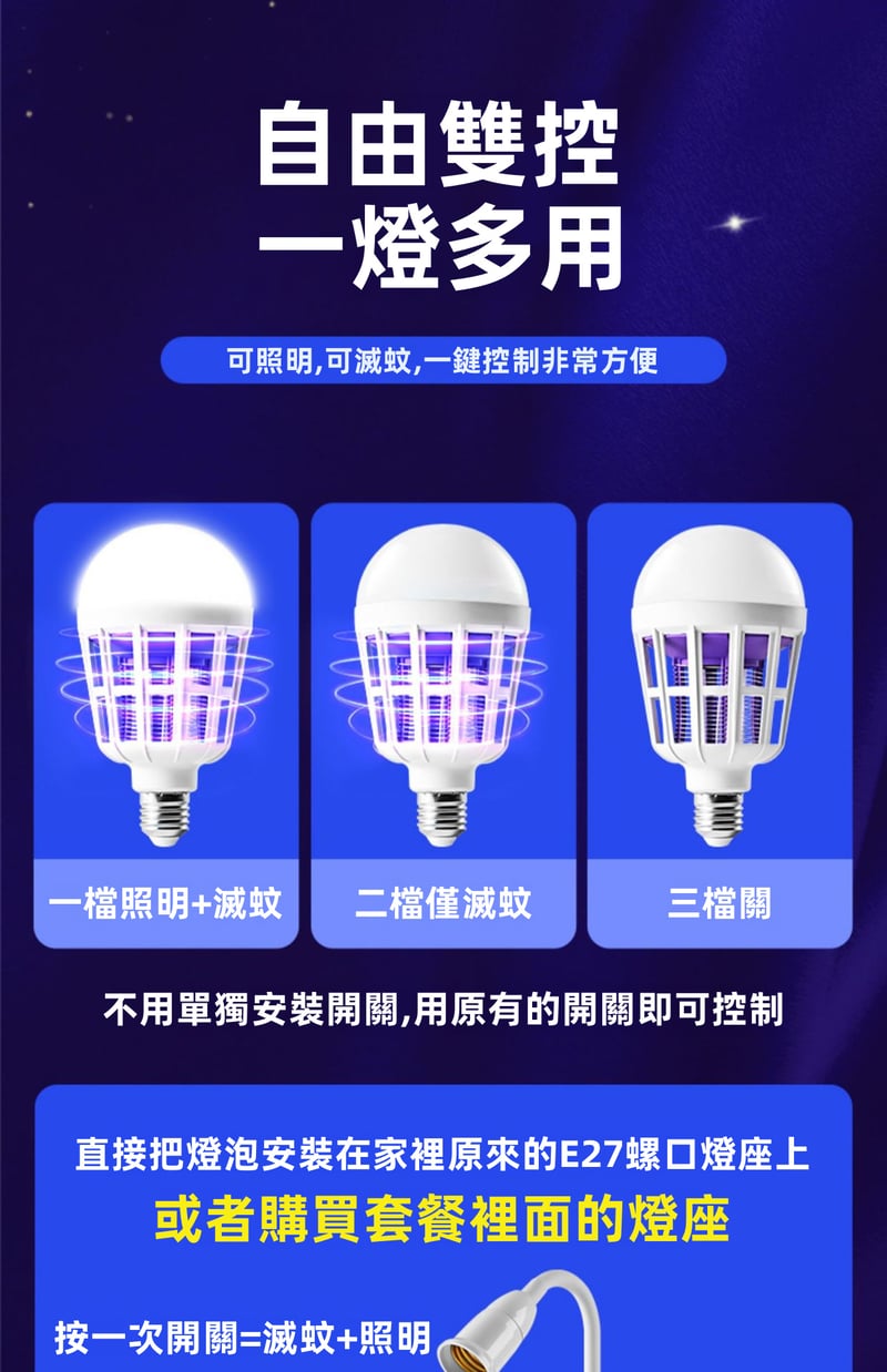 2分鐘前限時搶購 LED照明滅蚊燈E27螺口一擰即裝,UV紫光誘蚊,節能LED無頻閃,護眼超安全,居家戶外兩相宜 - 3入組-【均價399】NT$1199